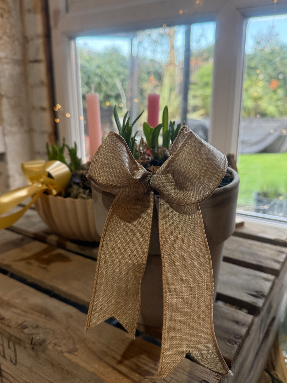 A mix of spring bulbs and flowers with colour themed candles.